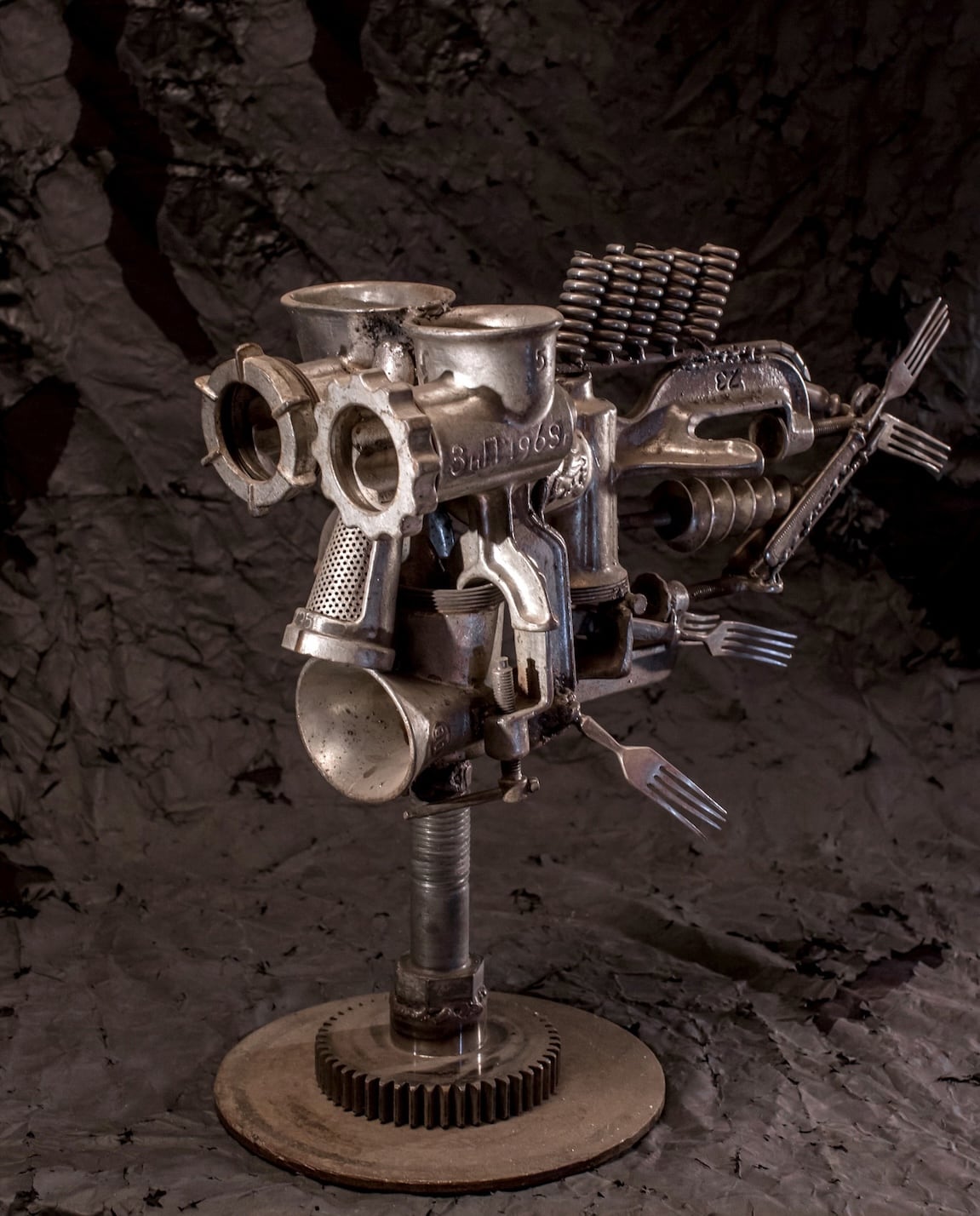 “Cuando me regalaron una soldadora, le busqué un uso, tenía muchas ganas de trabajar con ella”, cuenta Andrei Sikorsky. “Encontré picadoras de carne en el taller y empecé a fantasear sobre qué podía hacer con ellas. Enseguida vi que tenían grandes ojos. Les añadí algunas piezas hasta que conseguí este “Pez Carne”.