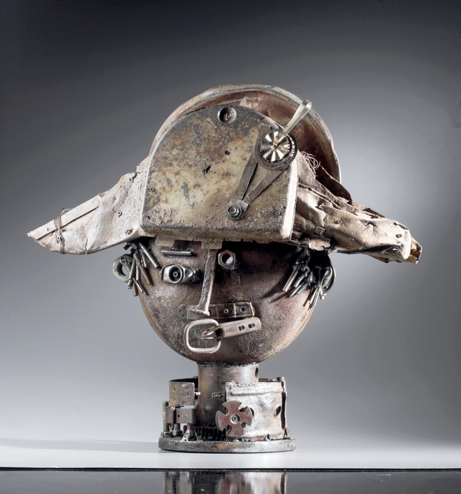 Una vez, paseando por la orilla del golfo de Finlandia, vi una cosa hermosa y oxidada en el agua. No me dio tregua. Tuve que ir allí, meterme en el agua helada para sacarla. La saqué. “¡Se podía hacer una cabeza con ella!”, recuerda el artista. “Empecé a hacerla, sin darme cuenta de lo que saldría. Y salió Napoleón. Le añadí un triángulo, un busto… y aquí está, ‘Napoleón’, maltrecho y destartalado”.