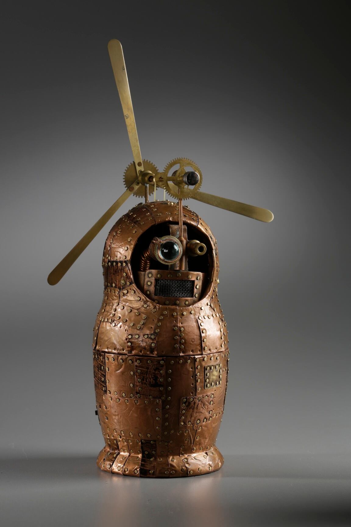 Esta muñeca matrioska es un robot que hace girar una hélice y parpadea, no está hecho de basura, sino de piezas de recambio. Está hecha al estilo steampunk que tanto le gusta a Sikorski. Según él, cogió una matrioska de madera corriente, la cubrió con planchas de hojalata y le añadió detalles steampunk.