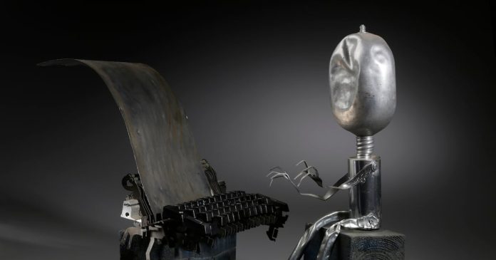 “Su cuerpo está hecho de una lata de aluminio de colonia “Paco Raban”, por eso le puse ese nombre”, dice el autor. “La cabeza de Paco está hecha con una cantimplora del ejército. Hemos utilizado tenedores, cucharas, un trozo de máquina de escribir, de la que sobresale una hoja de aluminio con la inscripción ‘Silencio’”.