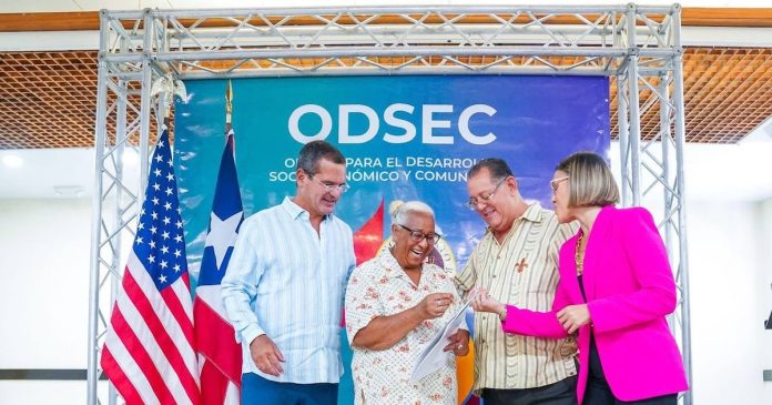 El gobernador de Puerto Rico, Pedro R. Pierluisi, entregó 98 títulos de propiedad a familias en Dorado, junto al secretario del Departamento de la Vivienda, William Rodríguez Rodríguez y la directora ejecutiva de la Oficina de Desarrollo Socioeconómico y Comunitario (ODSEC), Thais Reyes Serrano.