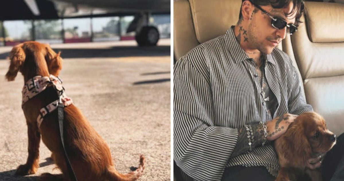 La primera imagen compartida muestra a la perrita mirando hacia adelante con un avión de fondo, acompañada por el mensaje “Saludos desde la Toscana”, y ya ha recibido 8,080 likes y más de 2,000 comentarios.