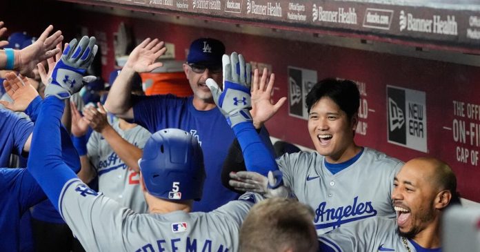 PHOENIX (AP) — Shohei Ohtani, Mookie Betts y Freddie Freeman iniciaron el juego con jonrones consecutivos, la primera vez que ha sucedido eso en los 141 años de historia de los Dodgers, y Tommy Edman pegó un sencillo productor de dos carreras en el noveno episodio para darle el sábado a Los Ángeles la victoria sobre los Diamondbacks de Arizona, 8-6 .