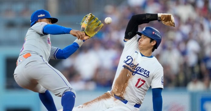 Ohtani fue puesto out tratando de llegar a la segunda base por el receptor de los Mets de Nueva York, el venezolano Francisco Álvarez, para el último out de los Dodgers de Los Ángeles en la segunda entrada en el primer partido de la Serie de Campeonato de la Liga Nacional el domingo.