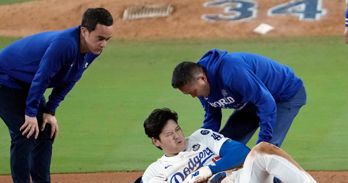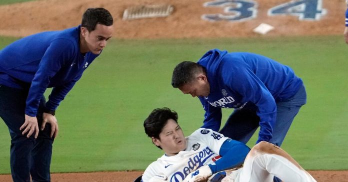 Ohtani se lastimó al deslizarse hacia la segunda base cuando fue atrapado robando para terminar la séptima entrada de la victoria del sábado por la noche por 4-2 sobre los Yankees de Nueva York en el Juego 2 en Los Ángeles.