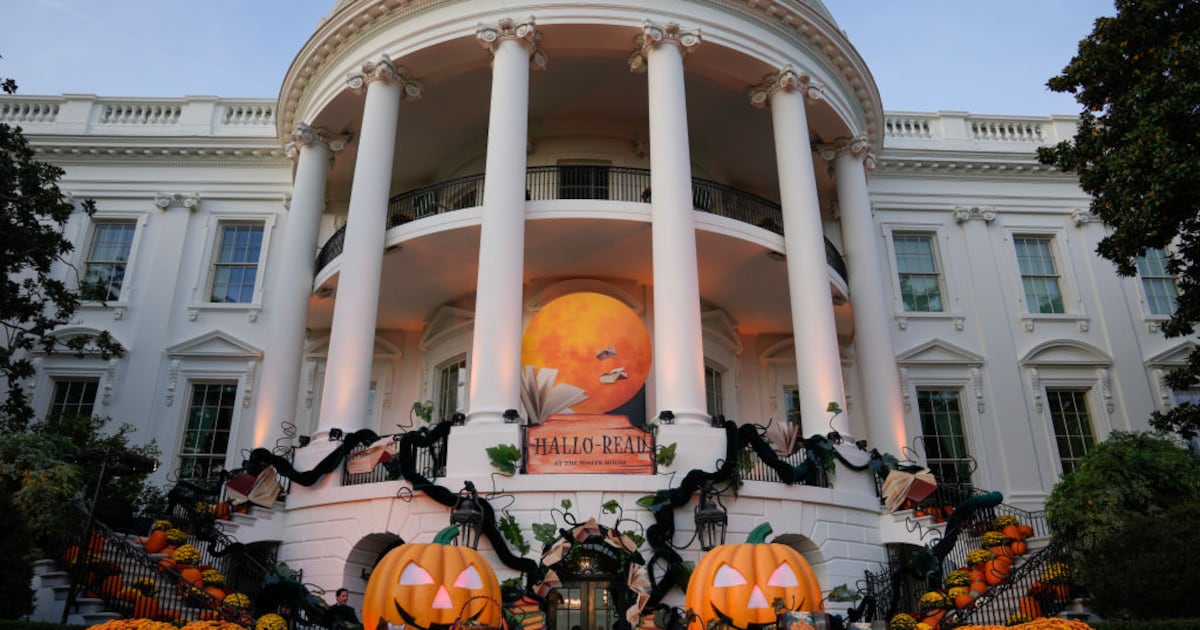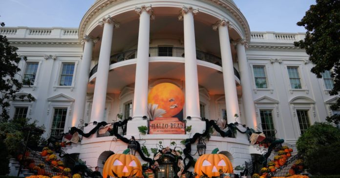 A member of the Marine Corps honor guard salutes as President Joe Biden and first lady Jill Biden leave after hosting local area students, military-connected children, and neighborhood families for trick-or-treating, ahead of Halloween on Thursday, at the South Lawn of the White House in Washington Wednesday, Oct. 30, 2024. (AP Photo/Ben Curtis)
