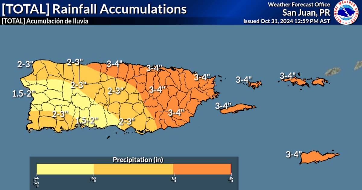 Se anticipa que las áreas del norte y este de Puerto Rico, así como Vieques, Culebra y las Islas Vírgenes, podrían recibir acumulaciones de lluvia de entre 3 a 4 pulgadas, con cantidades localmente superiores que podrían alcanzar hasta 6 pulgadas en algunas zonas. En el resto de la región, se espera una acumulación de lluvia de entre 1 y 3 pulgadas.