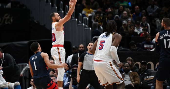 Los primeros tres triunfos de Golden State en esta racha de triunfos llegaron sin Curry, pero fue capaz de iniciar ante los Wizards, aunque solamente jugó 24:05. Curry abrió la pizarra con un triple, después no volvió a anotar hasta que superó a la chicharra con un triple al final de la primera mitad que le do una ventaja de 54-45 a los Warriors.