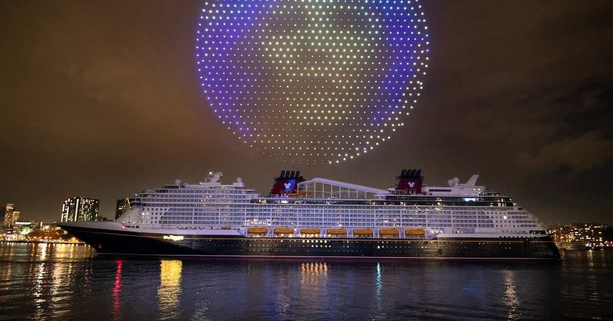 El espectáculo de bautizo Disney Treasure culminó con los drones formando una botella de champán de 65 pies de alto que estalló en un gran final de pirotecnia burbujeante mientras las voces de toda The Walt Disney Company, los padrinos honorarios del Disney Treasure que dan vida a las historias de Disney todos los días, recitaban una bendición tradicional para otorgar buena suerte al barco y a sus pasajeros.