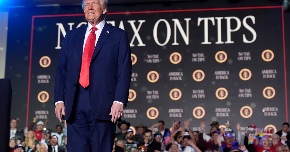 “Lo vamos a conseguir para ustedes, ‘sin impuestos sobre las propinas’”, dijo Trump, de pie detrás de un podio adornado con el mismo eslogan que usó durante toda la campaña de 2024.