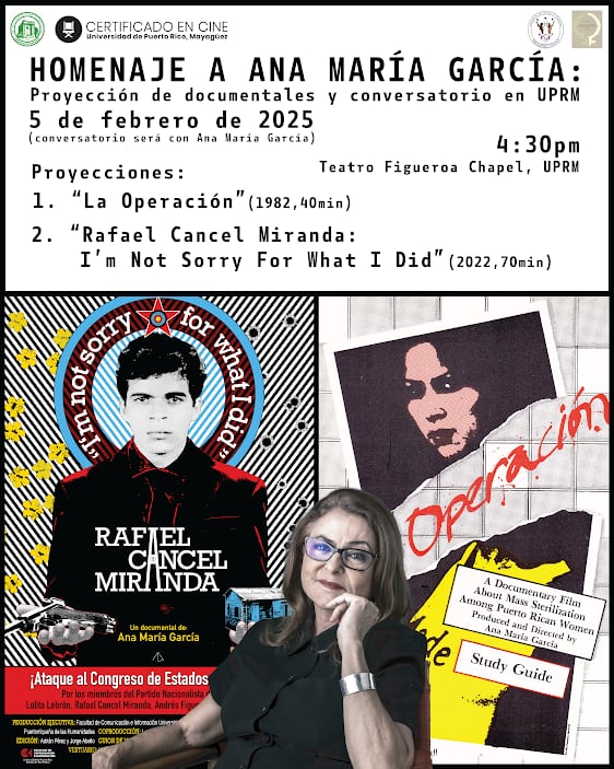 La cineasta Ana María García, pilar del cine nacional y mentora de las mentes más brillantes del cine puertorriqueño actual, presentará sus documentales La Operación (1982) y Rafael Cancel Miranda: I’m Not Sorry For What I Did (2022), en el Teatro Figueroa Chapel, del Recinto de Mayagüez (RUM) de la Universidad de Puerto Rico (UPR).