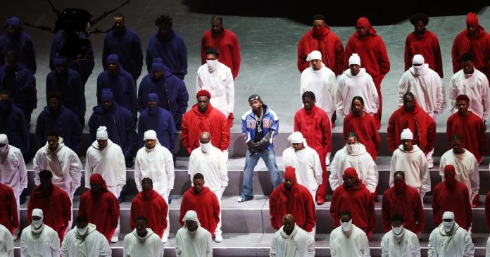 El escenario simulaba una larga calle con postes de luz, recreando un ambiente urbano. Acompañado de un gran número de bailarines vestidos en blanco, azul y rojo, los colores de la bandera de Estados Unidos, Lamar recorrió el escenario mientras la cámara lo seguía de cerca, capturando la intensidad de cada movimiento.