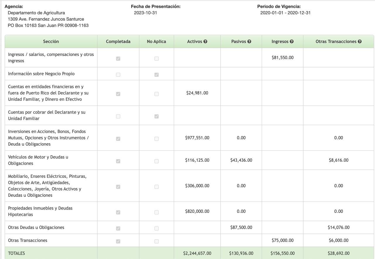 El resumen anterior permitía ver la cantidad de dinero ingresado por un negocio propio del servidor público, la cantidad que mantenía en entidades financieras, la cantidad invertida en bonos, acciones y otros instrumentos. Se indicaba el valor estimado de los vehículos de motor que poseía; de sus propiedades inmuebles, una apreciación económica de los objetos de arte, joyería, colecciones, entre otros activos. De igual manera, se indicaba, en dólares y centavos, las deudas y obligaciones del funcionario, como hipotecas y préstamos.