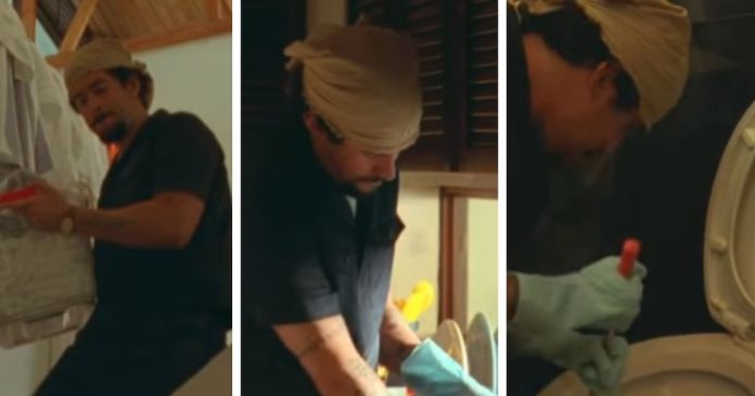 En el mismo, se observa al artista boricua limpiando una habitación luego de una evidente celebración por motivo de San Valentín.