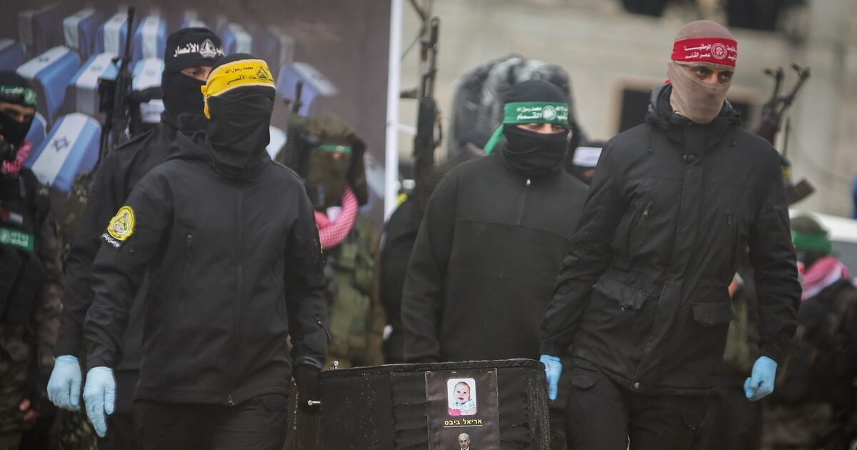 Milicianos de Hamás exhibieron cuatro ataúdes negros en un escenario en medio de las ruinas de la ciudad sureña de Jan Yunis el jueves, rodeados de pancartas, incluida una grande que retrataba al primer ministro Benjamin Netanyahu como un vampiro.