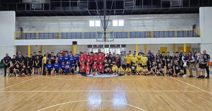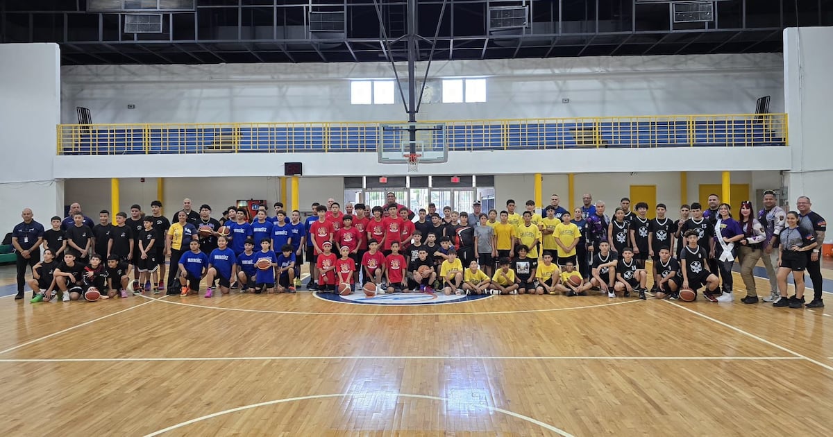 El sargento Carlos Vélez, director de la Liga Atlética Policiaca, junto a otros agentes, se unieron a los niños de los capítulos del área de Mayagüez en la inauguración del torneo de baloncesto infantil masculino en Aguadilla.