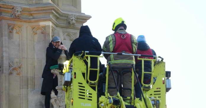 El tráfico alrededor del Palacio de Westminster en Londres quedó paralizado durante gran parte del sábado mientras los equipos de emergencia intentaban llegar al hombre. Los negociadores fueron elevados varias veces en una plataforma de escalera de los bomberos antes de finalmente lograr convencerlo de que descendiera.