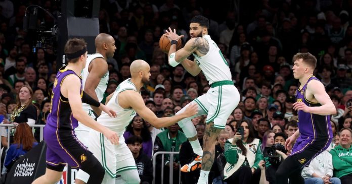 BOSTON (AP) — Jayson Tatum registró 40 puntos, 12 rebotes y ocho asistencias por los Celtics de Boston, que resistieron una última embestida de los Lakers de Los Ángeles, a quienes vencieron el sábado por 111-101.