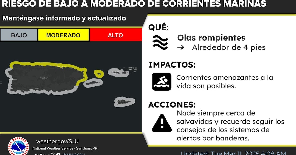 Mar 11: Low to moderate rip current risk should prevail across the islands. Beaches along the N and E PR, and Culebra should experience moderate risk of rip currents. pic.twitter.com/J3k1Uq3syn