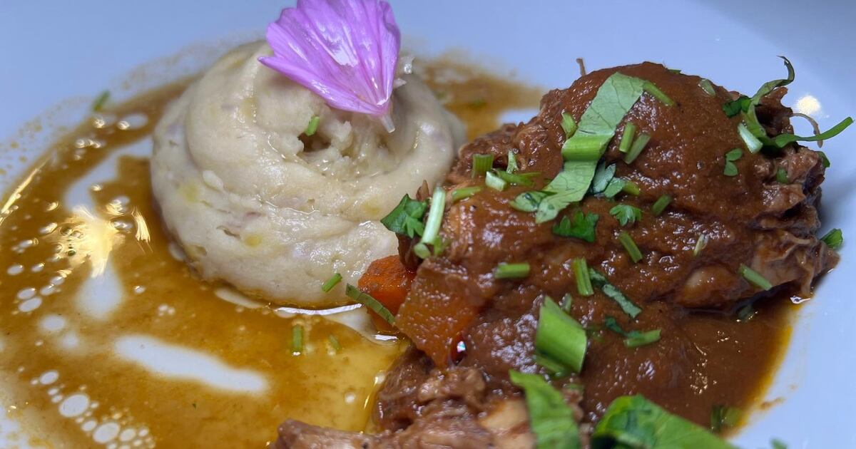 Cuarto curso: Fricasé de conejo con chocolate, servido con majado de apio criollo, malanga lila y aceite de trufa.