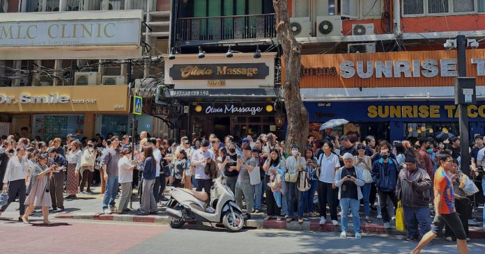 Al temblor del mediodía le siguió una fuerte réplica de magnitud 6,4, y se advirtió a los residentes de Bangkok que fueron evacuados de sus edificios que permanecieran en el exterior por si temblaba otra vez.