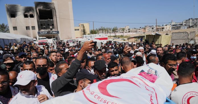 DEIR AL-BALAH, Franja de Gaza (AP) — Los palestinos realizaron funerales el lunes para 15 médicos y socorristas asesinados por tropas israelíes en el sur de Gaza, después de que sus cuerpos y ambulancias destrozadas fueran encontrados enterrados en una fosa común improvisada, aparentemente arrasada por excavadoras militares israelíes.