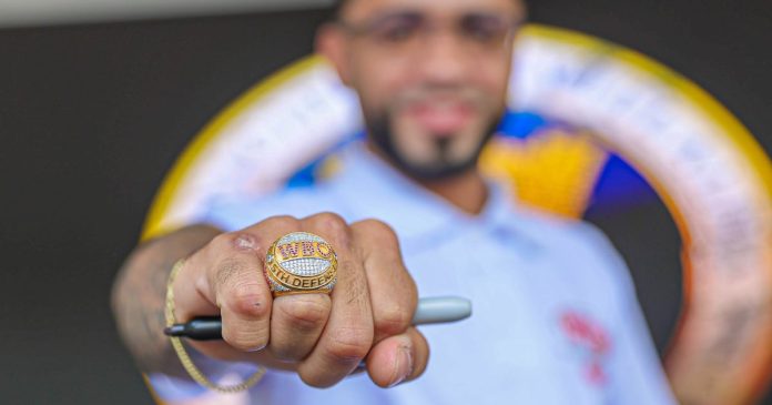 El pugilista puertorriqueño recibió la sortija rodeado de campeones y leyendas del ring, entre ellos el recién exaltado al Salón de la Fama Iván Calderón, el campeón peso ligero Keyshawn Davis, el campeón junior mosca René Santiago, y los excampeones Nelson Dieppa, Alex ‘El Nene’ Sánchez y Alberto Machado.
