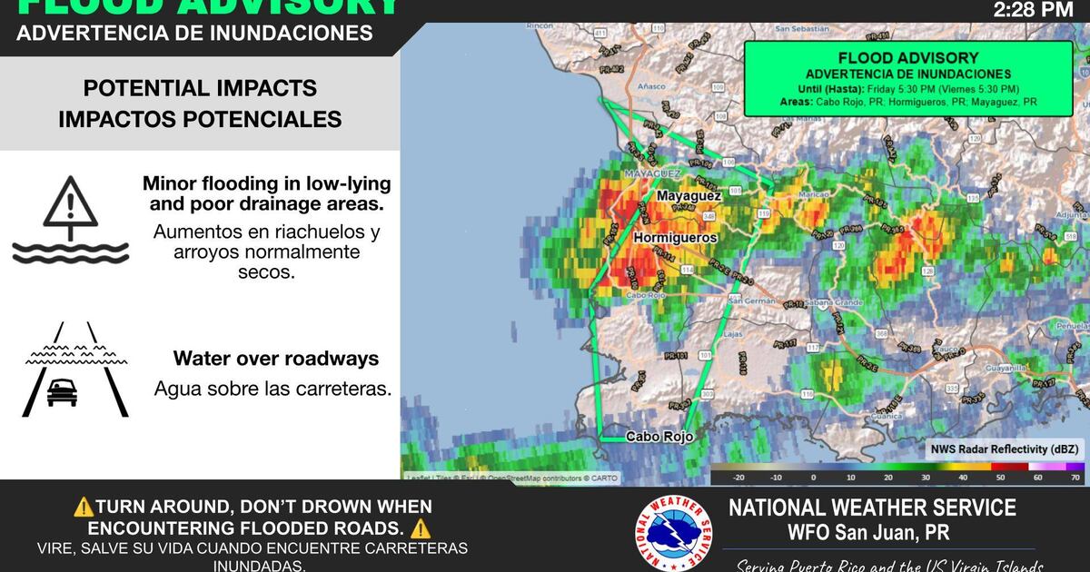 El Servicio Nacional de Meteorología (NWS, por sus siglas en inglés) en San Juan emitió este viernes viernes una advertencia de inundaciones urbanas y de pequeños riachuelos para los municipios de Cabo Rojo, Hormigueros y Mayagüez, vigente hasta las 5:30 de la tarde.