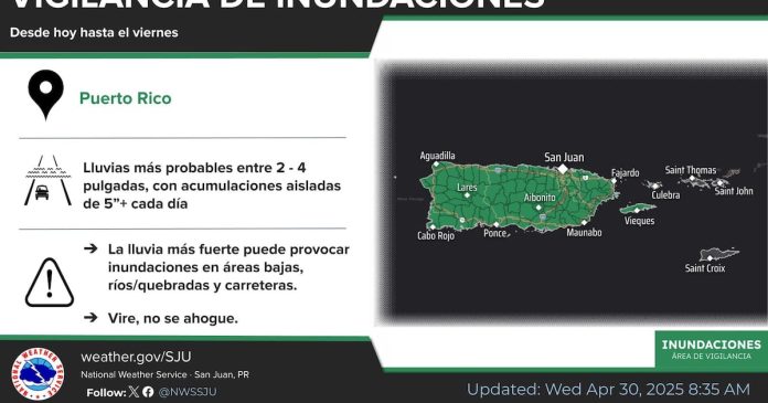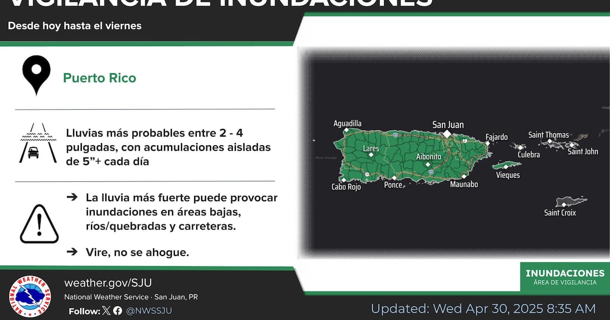 Siguen las lluvias intensas. El Servicio Nacional de Meteorología de San Juan (NWS, por sus siglas en inglés) dio a conocer este miércoles, 30 de abril de 2025 que todo Puerto Rico se encuentra bajo vigilancia de inundaciones hasta la mañana del viernes, 2 de mayo de 2025.