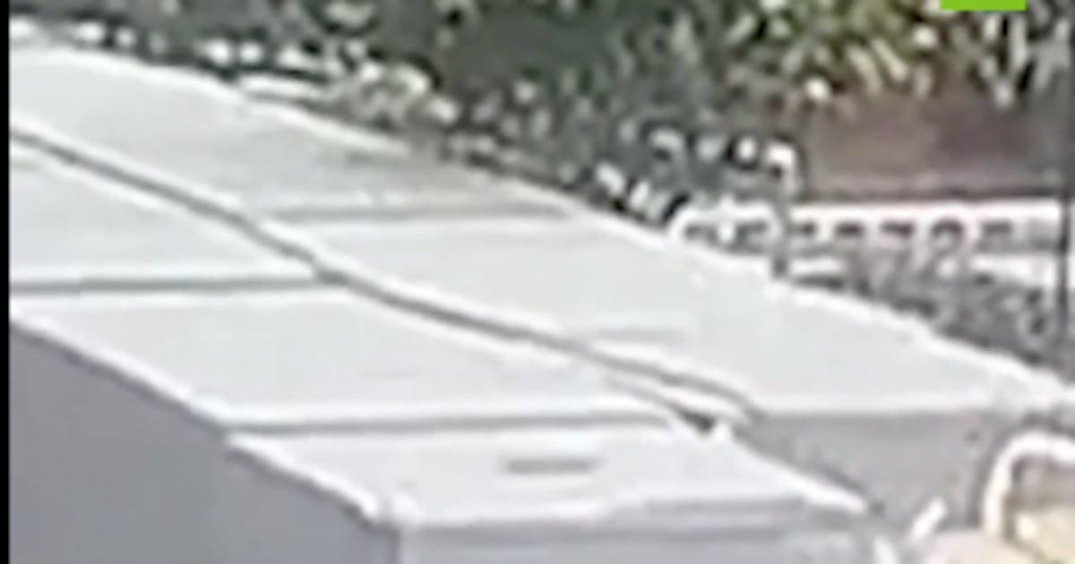 Las imágenes de la cámara de seguridad muestran cómo el brazo de la grúa, de aproximadamente 24 metros de longitud, se desprende desde lo alto y cae directamente al pavimento.