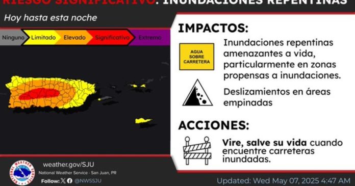 Las lluvias y tronadas durante la tarde del miércoles, podrían generar nuevamente inundaciones en las zonas del interior y oeste de Puerto Rico, según el informe del Servicio Nacional de Meteorología (SNM). El terreno sigue saturado tras varios días de precipitaciones, por lo que existe una probabilidad moderada a alta de deslizamientos de tierra en áreas montañosas.