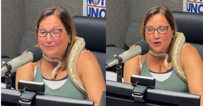 El periodista Alex Delgado retó este viernes a la locutora y productora Erika Camareno a leer los titulares de NotiUno 630 con una culebra en el cuello.