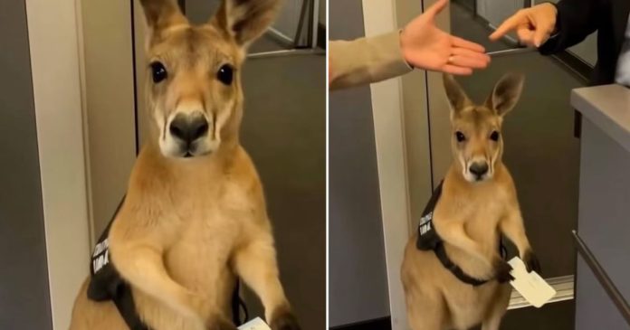 Una grabación de 10 segundos muestra a un canguro sosteniendo un boleto mientras permanece junto a dos mujeres, una de ellas con uniforme de aerolínea.