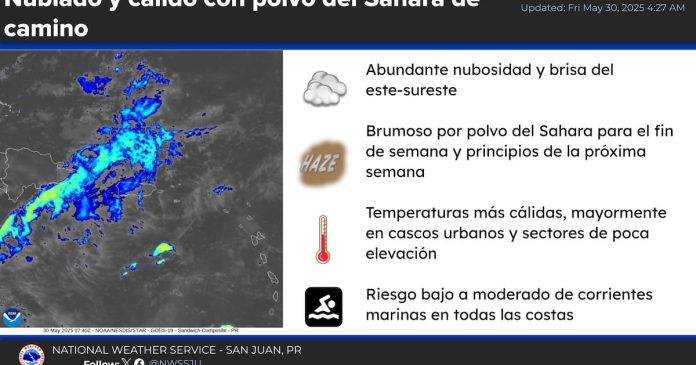 May 30: Se espera abundante nubosidad, pero con momentos de sol que elevarán las temperatura en zonas de baja elevación y urbanas. El riesgo de corrientes marinas es debajo a moderado. #prwx #usviwx pic.twitter.com/NpNSakOz72
