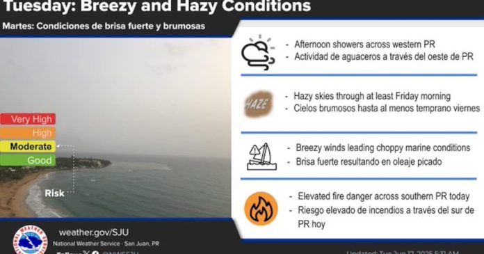 En los próximos días, un sistema atmosférico mantendrá los vientos soplando del este al sureste, con ráfagas que a veces serán fuertes. El polvo del Sahara seguirá causando cielos brumosos y afectando la visibilidad y la calidad del aire hasta el miércoles. Aunque la humedad disminuirá, durante las tardes podrían formarse lluvias y tormentas en la parte oeste y noroeste de Puerto Rico debido al calentamiento diario y los vientos que vienen del mar.