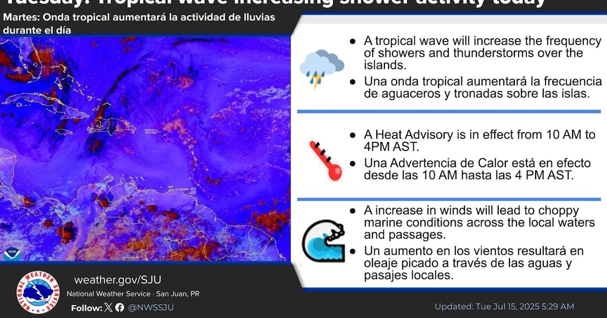 Bajo este patrón, se esperan lluvias y tormentas cada día en las islas. En las mañanas habrá lluvias dispersas en el este de Puerto Rico. Por las tardes, la combinación del calor, efectos locales y humedad favorecerá lluvias y tormentas en el centro y oeste de Puerto Rico, además de lluvias al este de El Yunque y el área metropolitana de San Juan y municipios cercanos.