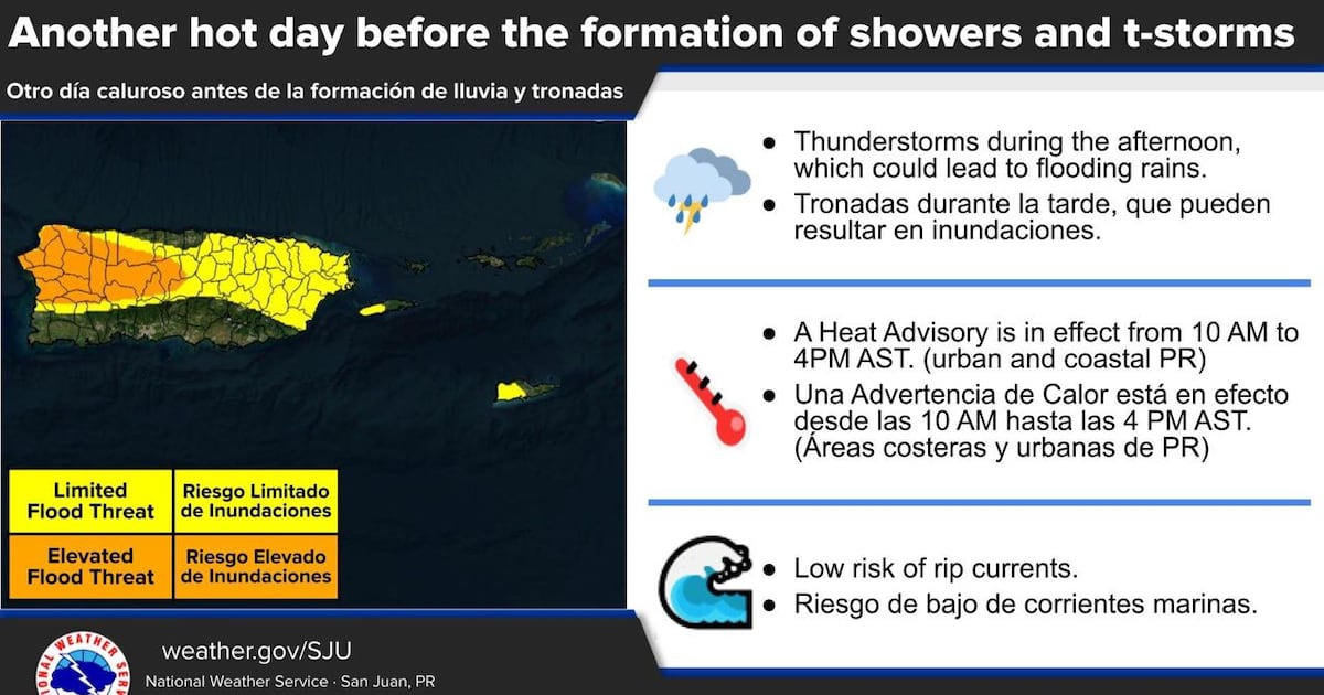 Para domingo y lunes se espera el patrón veraniego típico con chubascos en el este de Puerto Rico y las Islas Vírgenes, y lluvias con tronadas mayormente en el noroeste. Aunque la precipitación será localizada, no se descartan inundaciones urbanas menores.