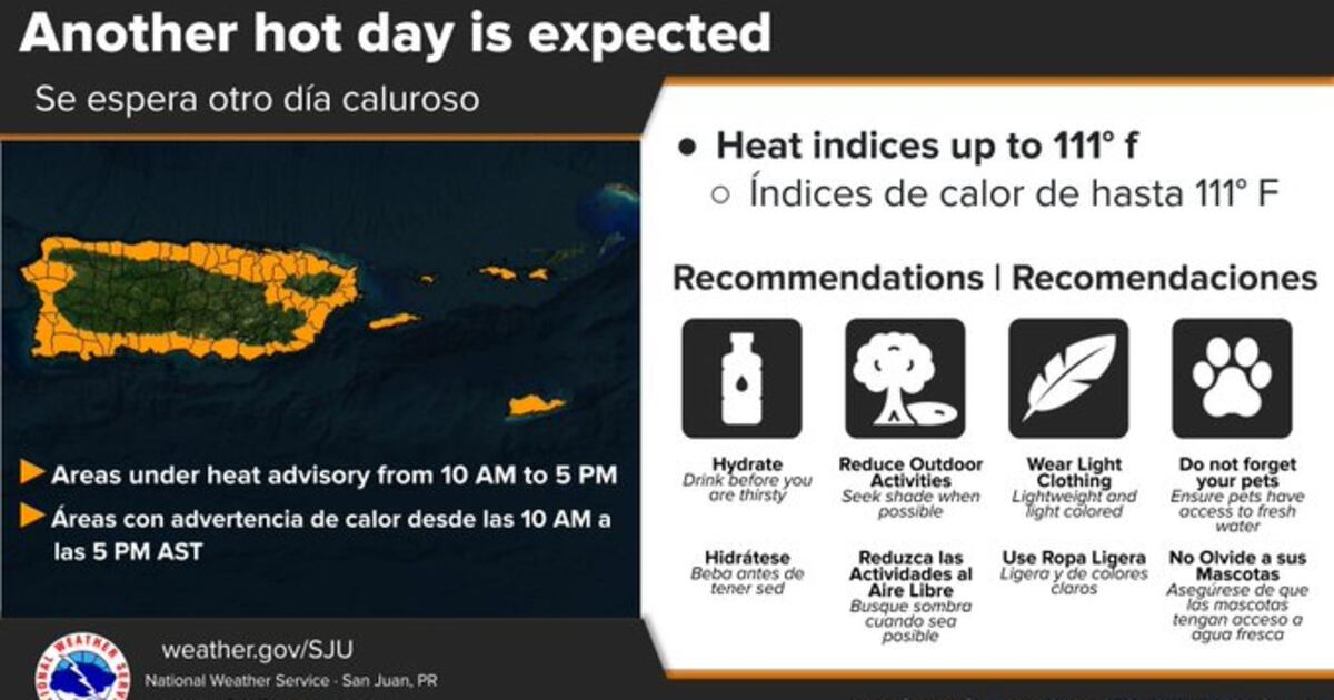 There is a heat advisory in effect from 10 AM to 5 PM.#prwx #usviwx pic.twitter.com/jlz8VG0zJM— NWS San Juan (@NWSSanJuan) September 3, 2025