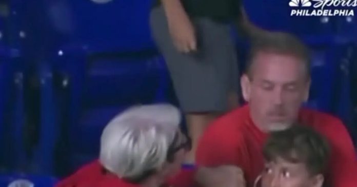 El padre luego regresó a donde estaba sentada su familia, aproximadamente a cinco asientos de distancia, y le entregó la pelota a su emocionado hijo, identificado por los Phillies como Lincoln.