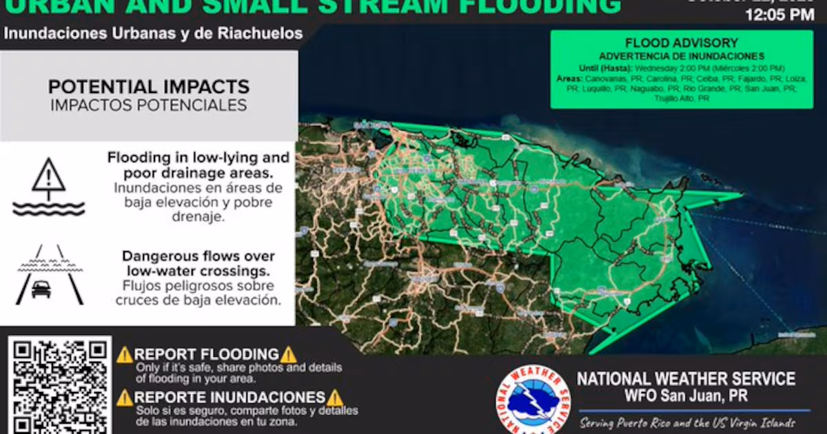 El Servicio Nacional de Meteorología (SNM) en San Juan emitió el miércoles, 22 de octubre de 2025, una advertencia de inundaciones urbanas y de riachuelos para los municipios de Canóvanas, Carolina, Ceiba, Fajardo, Loíza, Luquillo, Naguabo, Río Grande, San Juan y Trujillo Alto, vigente hasta las 2:00 de la tarde.