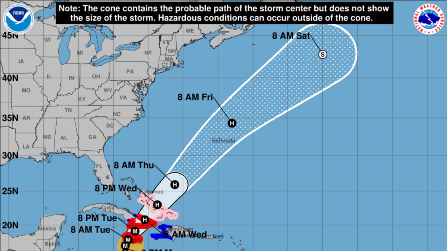 El NHC mantiene la advertencia de huracán para Jamaica y las provincias cubanas de Granma, Santiago de Cuba, Guantánamo y Holguín, mientras que se emite vigilancia de huracán para el sureste y centro de las Bahamas y las Islas Turks y Caicos. Se esperan oleajes peligrosos y corrientes de resaca en la región, especialmente en zonas costeras de Jamaica, Cuba y la Hispaniola.