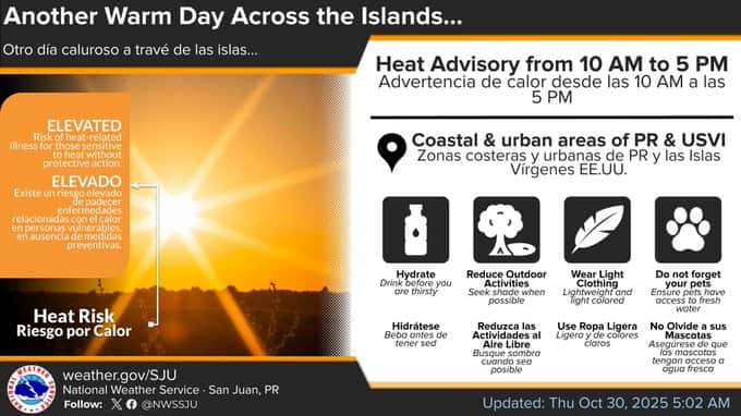 El Servicio Nacional de Meteorología emitió este jueves, 30 de octubre de 2025, una advertencia de calor desde las 10:00 a.m. hasta las 5:00 p.m. para las zonas costeras y urbanas de Puerto Rico.