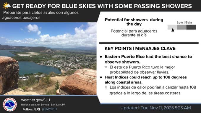 ☀️ ¡Cielos azules en camino! Algunos aguaceros pasajeros podrían desarrollarse, principalmente sobre el este de Puerto Rico. #PRwx #USVIwx pic.twitter.com/bciLqBqIii— NWS San Juan (@NWSSanJuan) November 11, 2025