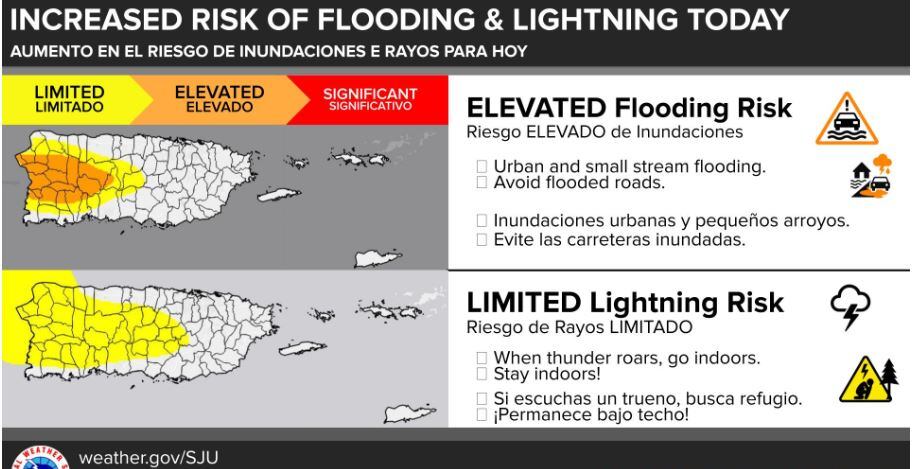 Durante el día, se espera el desarrollo de aguaceros y tronadas en el oeste de Puerto Rico, principalmente en la tarde. El SNM alertó sobre una probabilidad moderada de inundaciones urbanas o crecidas menores en riachuelos, por lo que pidió evitar zonas propensas a inundaciones y carreteras anegadas.