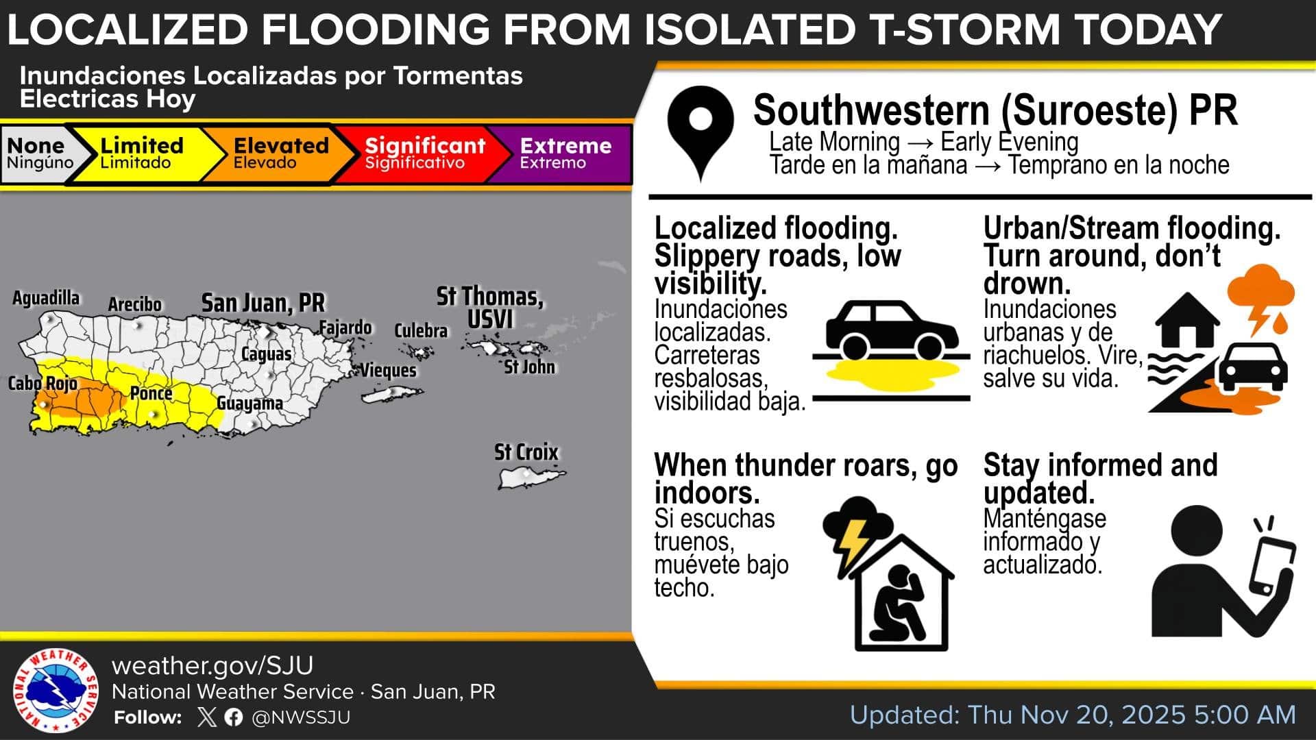 Para hoy, parcialmente nublado, tornándose mayormente nublado a mediodía. Aguaceros dispersos en la mañana y numerosos aguaceros con tronadas aisladas en la tarde. Máximas cerca de 88°F. Vientos del este de 5 a 10 mph. Probabilidad de lluvia 70%.