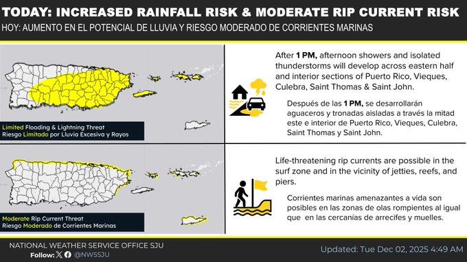 Puerto Rico. Informe del tiempo para el martes, 2 de diciembre de 2025. (X @NWSSanJuan)