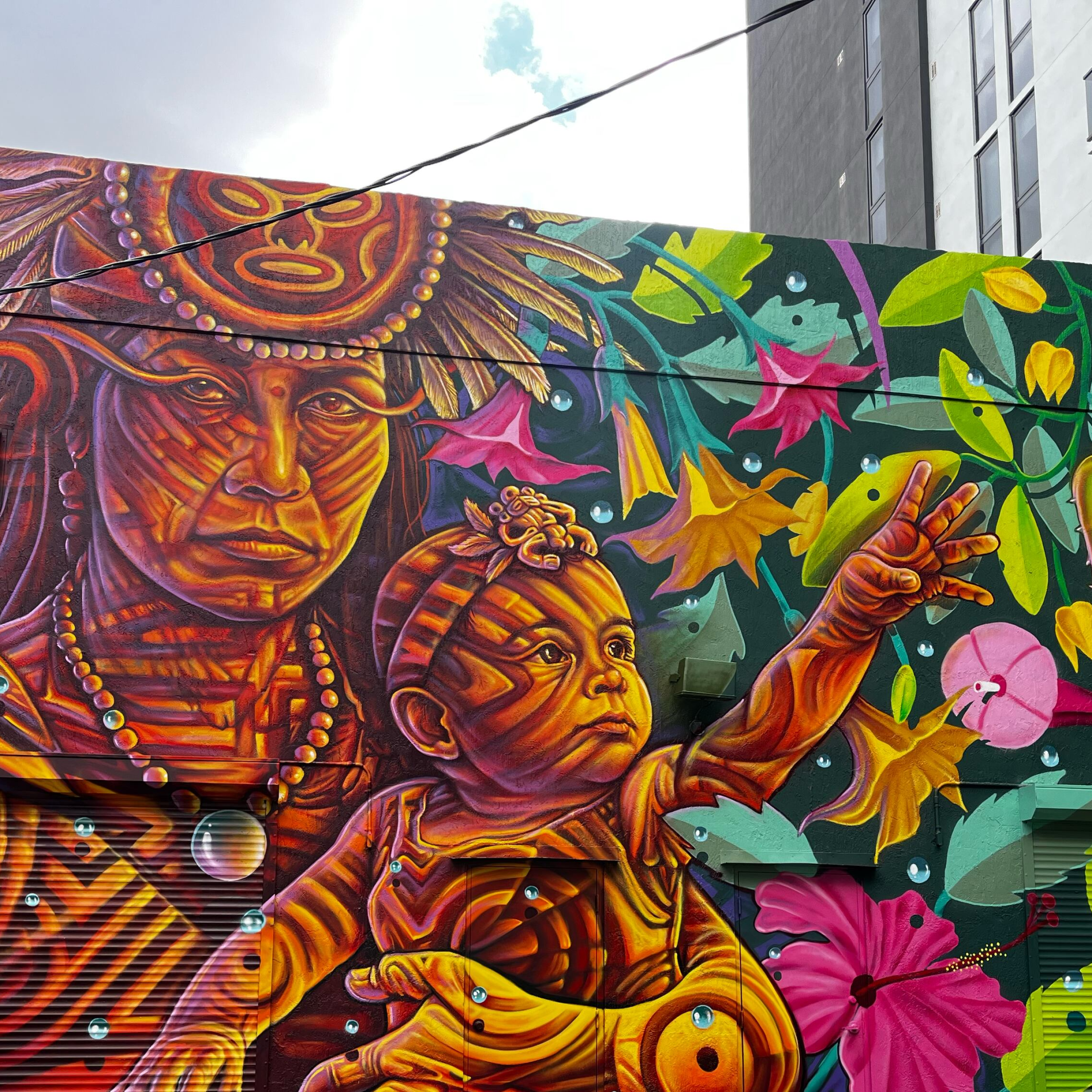 “Mi idea fue resaltar las raíces latinas y caribeñas que tiene el barrio de Wynwood. Es una representación de la familia y de las nuevas generaciones desde el punto de vista del pasado y del futuro: una cacica taína con un bebé en sus brazos que intenta alcanzar una guanábana. Mientras la dibujaba pensé: ¿qué será del Caribe en el futuro?”, expresó el muralista.