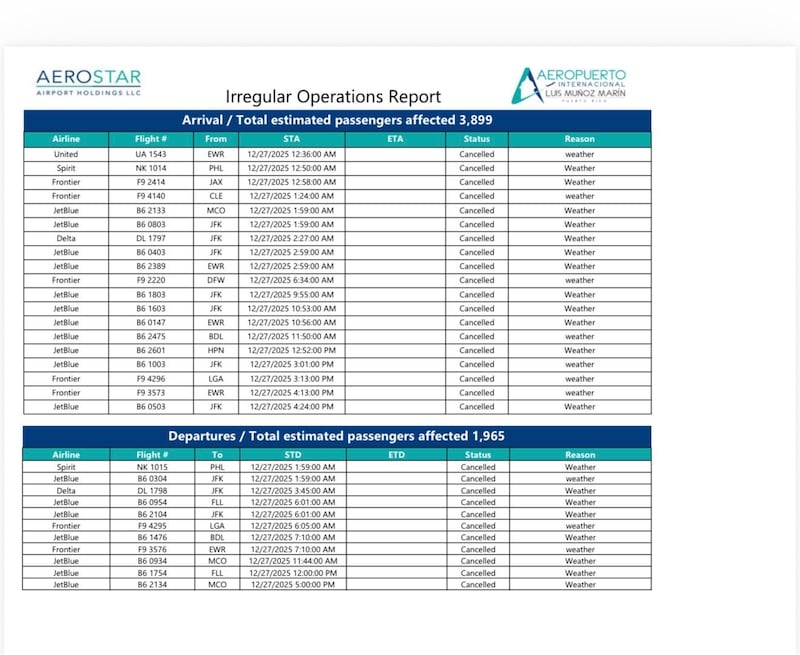 Reporte de operaciones irregulares en el Aeropuerto Luis Muñoz Marín. 27 de diciembre 2025.