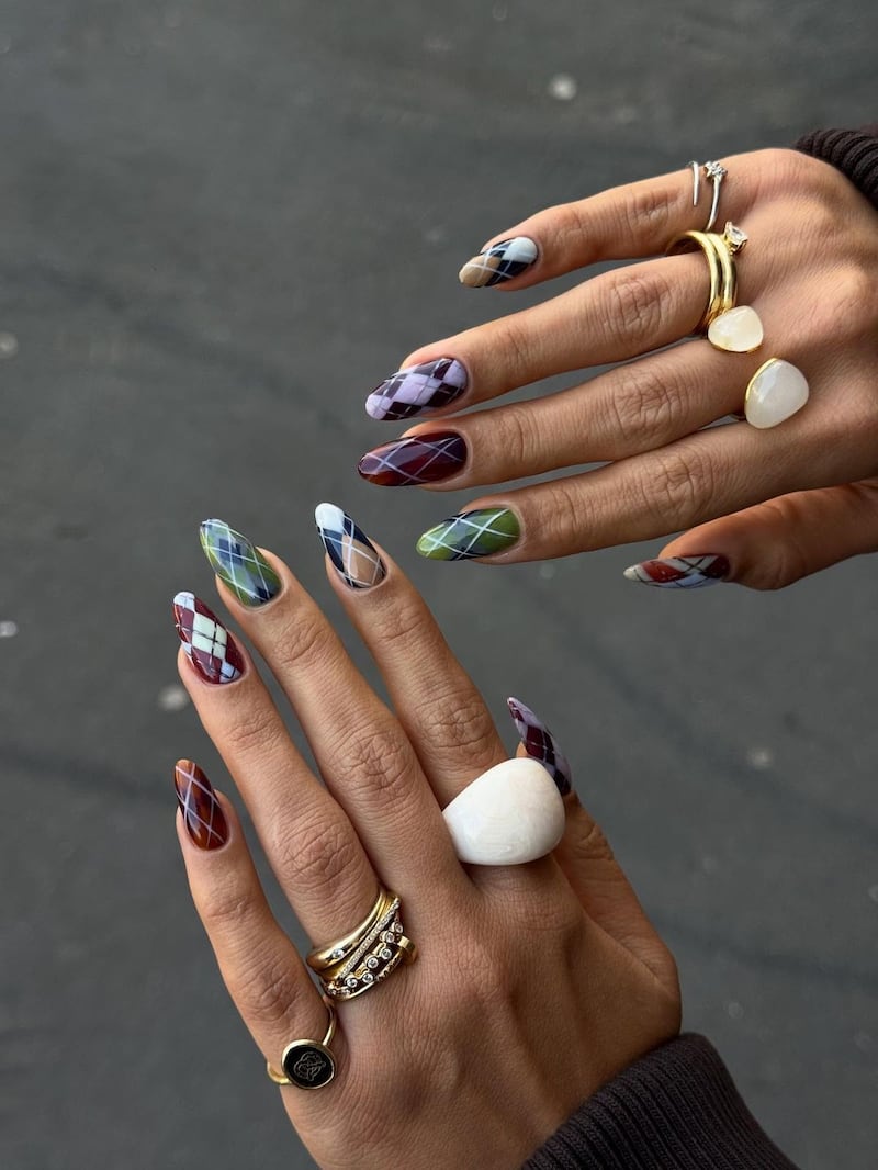 El estilo clásico con aire universitario también llega a las uñas. Los estampados de cuadros escoceses, argyle y rayas se mantienen fuertes gracias a la influencia de la moda y las pasarelas. Gina Edwards, manicurista y embajadora de Kiss Nails e ImPress Beauty, predice que los diseños preppy seguirán creciendo en popularidad, especialmente en versiones elegantes y bien definidas.