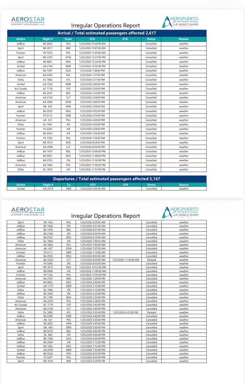 La compañía Aerostar Airport Holdings, responsable de las operaciones del Aeropuerto Internacional Luis Muñoz Marín en Carolina, informó este domingo que las condiciones del tiempo han provocado nuevas cancelaciones y retrasos en vuelos hacia y desde Estados Unidos.